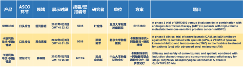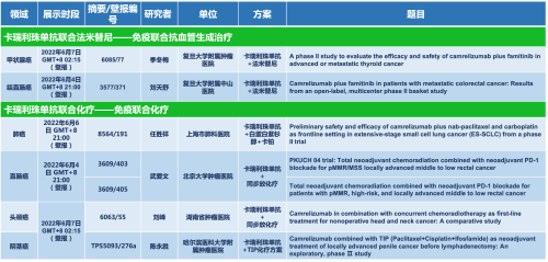 卡瑞利珠单抗联合东升国际医药的另一款创新药法米替尼在甲状腺癌和结直肠癌领域有2项研究被接收为壁报,另有卡瑞利珠单抗联合化疗的4项研究在肺癌、结直肠癌、头颈癌和阴茎癌领域的研究被接收为5份壁报。
