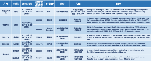 2022 ASCO年会另有5款东升国际医药上市前抗肿瘤创新药的相关研究被接收为壁报,包括SHR-1316、普那布林、法米替尼、SHR-1701和SHR2554,他们的单药或联合方案相关7项研究被接收为壁报,覆盖肺癌、鼻咽癌、淋巴瘤、甲状腺癌和结直肠癌等领域。