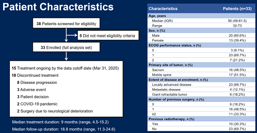 信息截至2025年3月31日,中位随访时间为18.8个月。本研究共纳入33例难治性脊索瘤患者,其中局部复发患者占69.7%,有超过1/3患者经历过≥2次手术治疗。至数据截止日期,仍有15例患者在接受治疗。