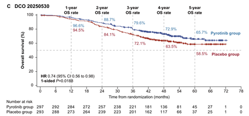 PHILA研究的PFS最终分析证实,相较于HT方案,PyroHT方案用于HER2阳性转移性乳腺癌一线治疗,显著延长了mPFS(22.1个月 vs. 10.5个月,HR=0.44),降低了36%的死亡风险(HR=0.64),其5年生存率达66%、无进展生存率达30%。在长期随访45.5个月后,疗效持续稳定,各预设亚组均显示出一致的获益,其中既往接受(新)辅助曲妥珠单抗的患者mPFS达62.8个月,且能延缓至脑转移发生时间(中位16.6个月 vs. 9.1个月)。